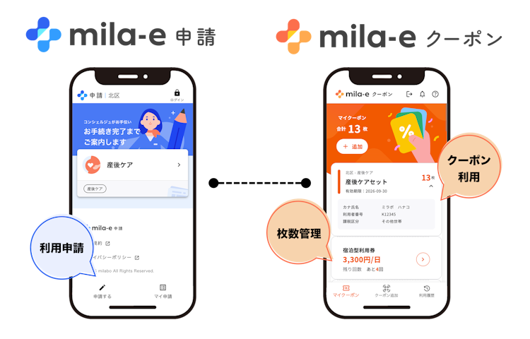 「mila-e(ミライー) クーポン」は、オンライン上で産後ケアなどのクーポン・回数券を発行し、 リアルタイムで利用履歴が確認できるデジタルクーポンサービスです。