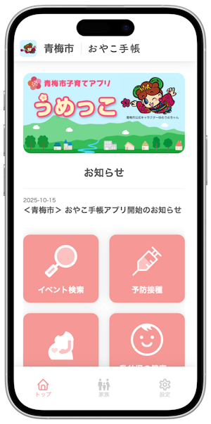 また 既存機能として、青梅市からのお知らせを月齢・年齢にあわせてタイムリーに受信できる「メール配信・プッシュ機能」、予防接種漏れや接種間隔ミスを防ぐことができる「予防接種AIスケジューラー」、成長グラフや乳幼児健診の記録など母子手帳の内容をマイページに記録できる「電子母子手帳 機能」なども 引き続きご利用いただけます。