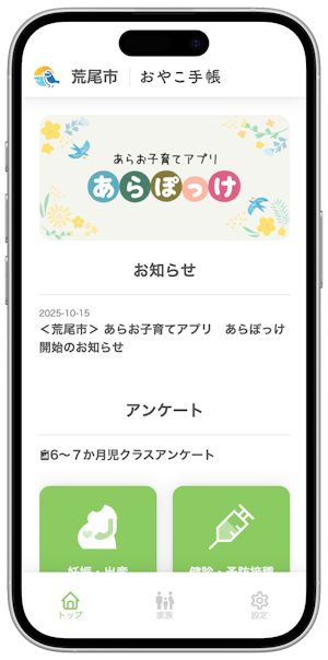 荒尾市からのお知らせを月齢・年齢にあわせてタイムリーに受信できる「メール配信・プッシュ機能」、予防接種漏れや接種間隔ミスを防ぐことができる「予防接種AIスケジューラー」、成長グラフや乳幼児健診の記録など母子健康手帳の内容をマイページに記録できる「電子母子健康手帳機能」などの機能をご利用いただけます。
