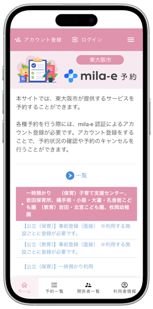 mila-e おやこ手帳 TOP画面の「オンライン予約」からアクセス後、お持ちのmila-e認証アカウントにてログイン、利用者情報を入力し予約を行ってください。
