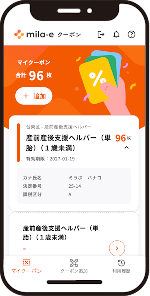 「mila-e(ミライー) クーポン」は、オンライン上で産後ケアなどのクーポン・回数券を発行し、 リアルタイムで利用履歴が確認できるデジタルクーポンサービスです。