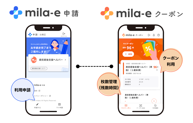 また、同時期よりデジタルクーポンサービス「mila-e クーポン」、自治体窓口DXサービス「mila-e 申請」も導入し、産後ケア事業を中心に運用しております。