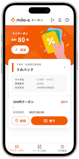 「mila-e クーポン」では、宇美町妊産婦応援事業 「うみパック」(妊産婦タクシー/妊産婦ヘルパー/産後ケア)を対象に、オンライン上でデジタルクーポンの発行・受取ができるほか、医療機関・施設・事業者等では利用者がQRコードを読み取るだけでクーポンの利用(消費)が可能となります。