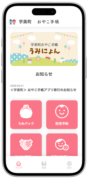 詳細は旧アプリ「子育て応援アプリ うみにょん」TOPページに表示されるご案内をご確認ください。
