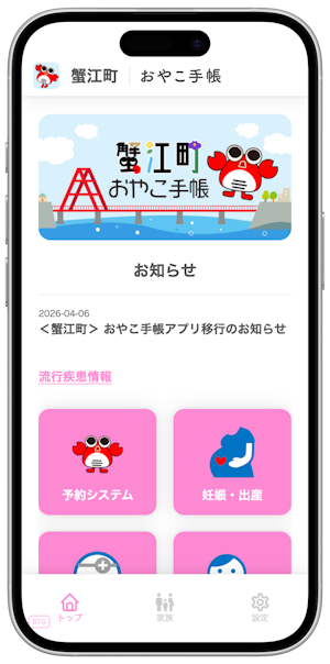 また 既存機能として、蟹江町からのお知らせを月齢・年齢にあわせてタイムリーに受信できる「メール配信・プッシュ通知機能」、予防接種漏れや接種間隔ミスを防ぐことができる「予防接種スケジューラー」、成長グラフや乳幼児健診の記録など母子手帳の内容をマイページに記録できる「電子母子健康手帳 機能」なども 引き続きご利用いただけます。